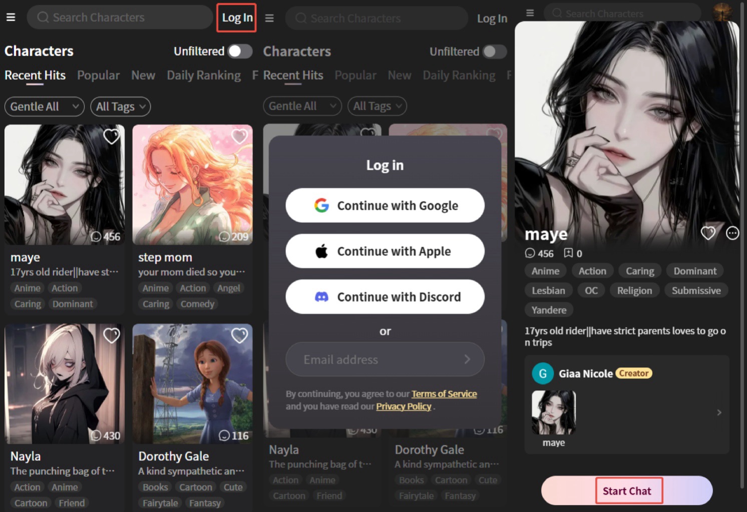 Step 3: After logging in, based on the character tags introduction, choose the character you like and start chatting.
