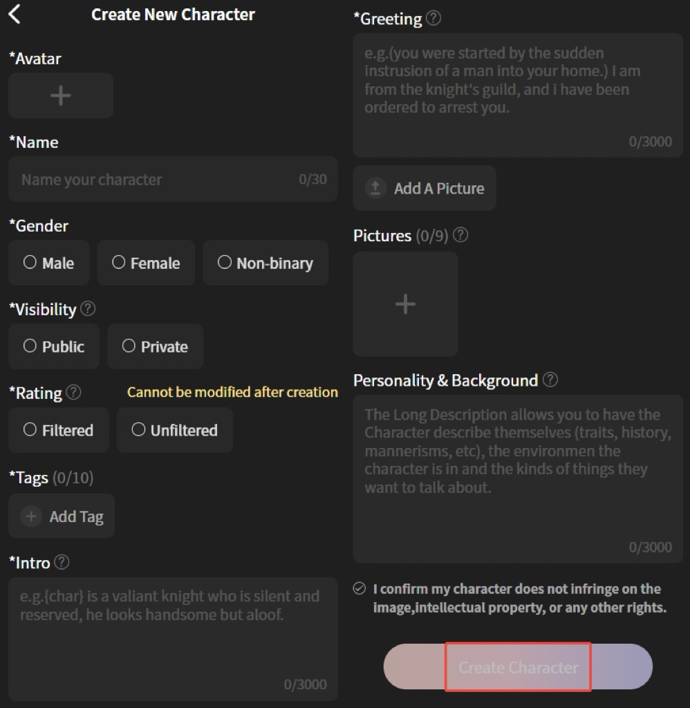 Step 5: Click "Create Character" to create the character.