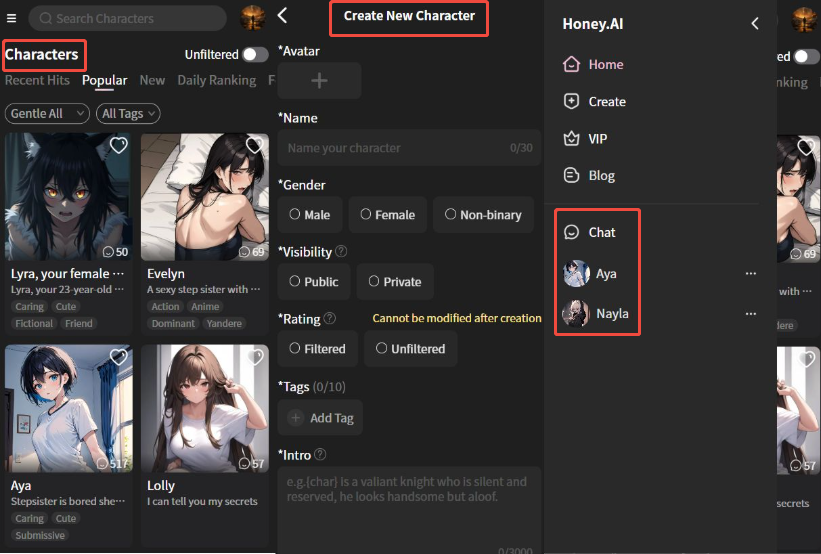 - Unlimited customization possibilities: Unlike the compromises often made in real-life relationships, on the Honey AI platform, you can customize personality details and set exclusive background stories.