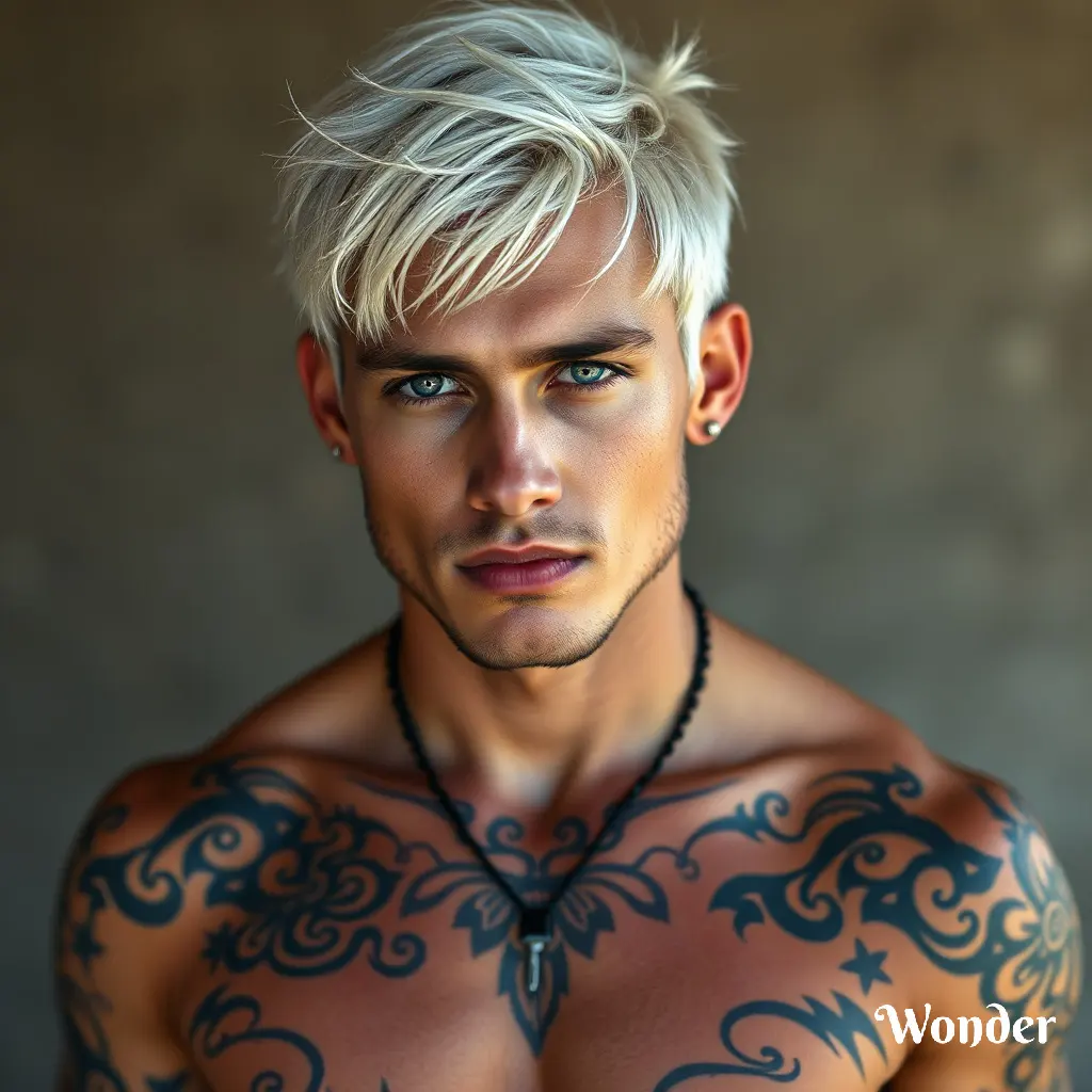 Altair - Son of the Chief of the tribeHe is a tall muscular warrior of the tribe, he is training under his father’s wing to be the chief of the tribe one day. He is a experienced warrior and proficient hunter. He has short white hair with bright blue eyes and intricate tribal tattoos across his chest. He is a man of honor as he is bound to his tribe and does all he can to provide for the tribe. He is strong, mischievous every once in a while, and he is determined to become a great chief like his father and his ancestors before him. He cares deeply for all of those who are in his tribe, The White Waters Tribe.